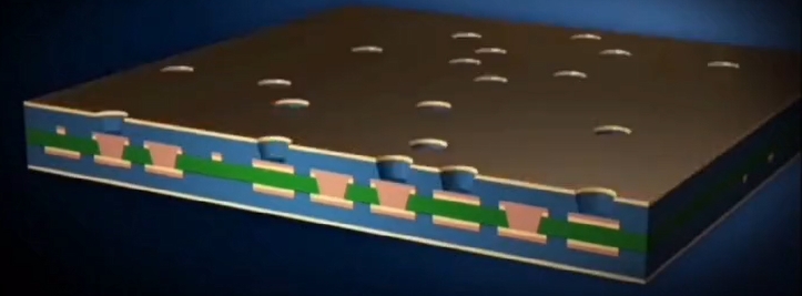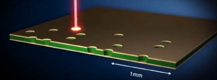 2. Using “laser processing” drill holes with “a diameter of approximately 0.1mm” in the copper foil and resin.
